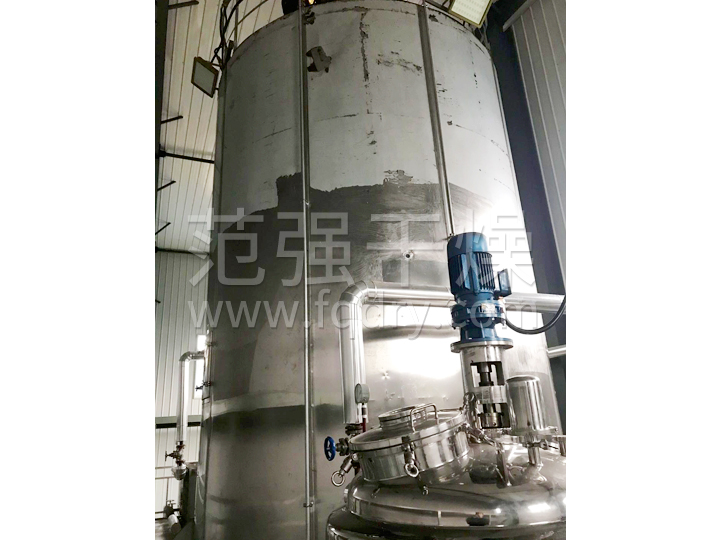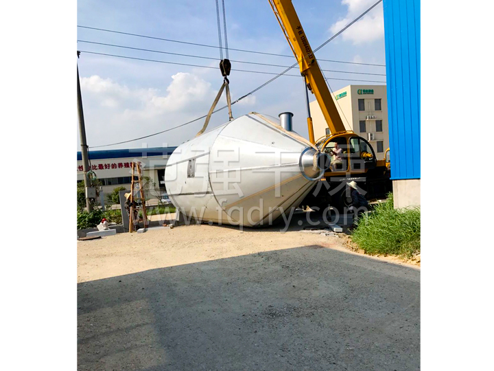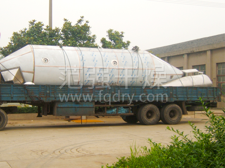 本機組工作過(guò)程為料液通過(guò)隔膜泵高壓輸入,噴出霧狀液滴,然后同熱空氣并流下降,大部分粉粒由塔底排料口收集,廢氣及其微小粉末經(jīng)旋風(fēng)分離器分離,廢氣由抽風(fēng)機排出,粉末由設在旋風(fēng)分離器下端的授粉筒收集,風(fēng)機出口還可裝備二級除塵裝置,回收率在96-98%以上。