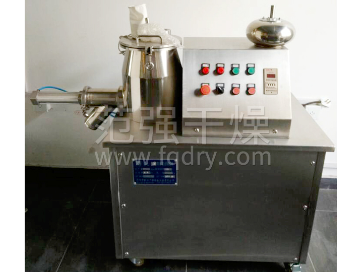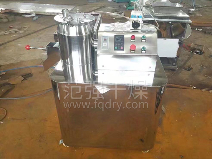 粉體物料與粘合劑在圓筒形容器中由底部混合漿充分混合成濕潤軟材,然后由側置的高速粉碎槳切割成均勻的濕顆粒。