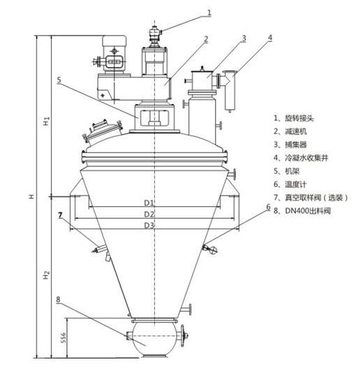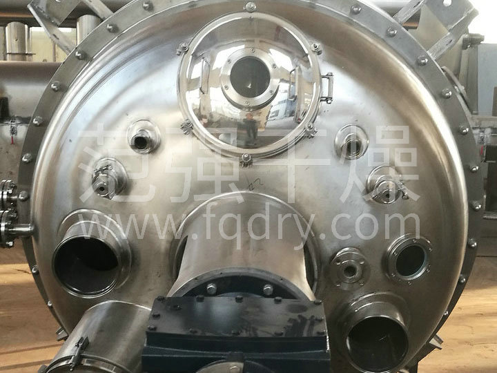 B帶加熱夾套的下錐體:內表面光滑、無(wú)死角,可以使物料得到充分干燥。出料時(shí)借助攪拌器的旋轉,使出料迅速、干凈。